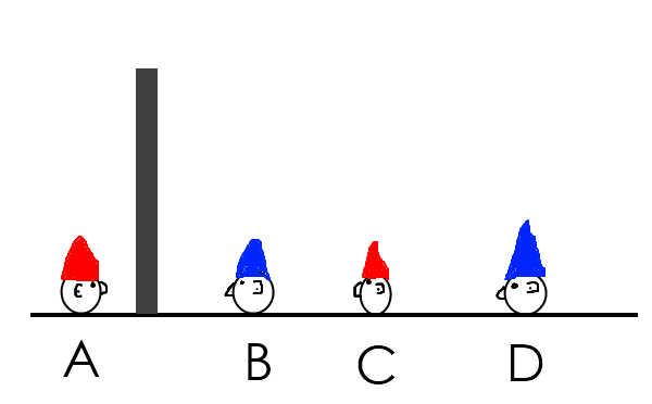 C! D berättar för C vilken färg han har på sin mössa.-