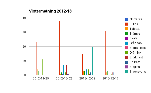 Blåmes och Talgoxe lite sparsamt och mycket gott om Pilfink precis som vanligt. Det som stack ut var att vi inte hade en enda gråsparv under själva räkningen, och bara en ensam hona under hela dagen.